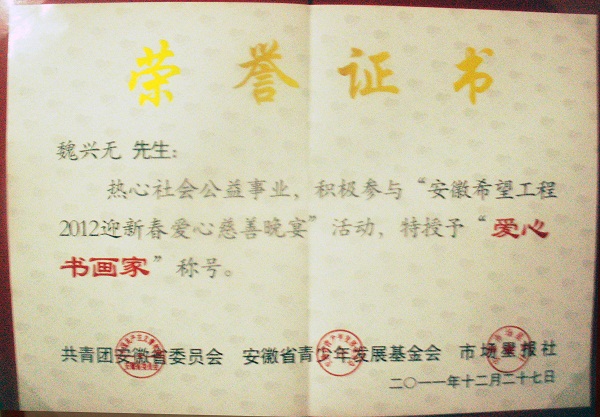 安徽省委常委、省委宣傳部部長(cháng)、副省長(cháng)唐承沛,省人大副主任張俊、省政協(xié)副主席李宏塔以及省直有關(guān)單位的負責同志出席了晚宴,并為捐贈單位和個(gè)人頒發(fā)了紀念水晶杯和和“愛(ài)心書(shū)畫(huà)家”稱(chēng)號的榮譽(yù)證書(shū)。