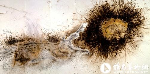如果說(shuō),蔡國強早期的火藥畫(huà)還必須依附于其他材質(zhì)才能完成的話(huà),那么他赴日之后的火藥畫(huà)就要純粹得多。他開(kāi)始用火藥畫(huà)來(lái)完成大型爆破計劃的草圖,《為外星人作的計劃》等系列均是用火藥和水墨直接在紙上完成,黑色的火藥在白色的紙上留下了悲哀婉愴的痕跡。在蔡國強看來(lái),火藥不僅是一種瞬間即逝的破壞性材質(zhì),更是他對現實(shí)和歷史直抒胸臆的表達。