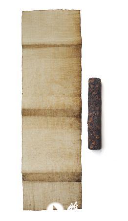 姜吉安:實(shí)際上也是,這個(gè)是比較早的,但是這個(gè)顏料已經(jīng)是按照中國畫(huà)顏料的方法做的,加膠和礬,周邊的絹燒下來(lái)弄碎,弄碎以后,拿一個(gè)鐵鍋,把鍋燒熱了以后,把絹放里頭炒,炒就變深了,變深了以后,就很容易碎,再拿專(zhuān)門(mén)研國畫(huà)顏料的工具,搗碎以后加水,加水以后再煮,一百度的水煮,煮了以后就出顏色了。出顏色以后再過(guò)濾,過(guò)濾以后肯定有渣子,這一部分就是過(guò)濾的渣子,過(guò)濾出來(lái)的顏料等于水還是比較多,過(guò)濾好了以后,再用火燒,把水蒸發(fā),再把水蒸發(fā)掉,剩的就是比較濃的顏料,再加膠礬。你想想都100度高溫了,可能比買(mǎi)來(lái)的那些顏料更穩定。