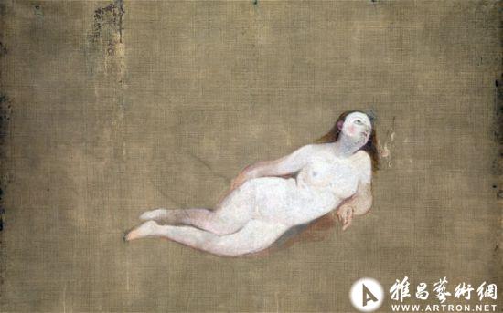 這幅肖像叫《兩個(gè)斜倚的裸女》,描繪了一個(gè)長(cháng)發(fā)、戴著(zhù)一只紅色耳環(huán)的裸女,第二個(gè)裸女僅用鉛筆勾勒出來(lái)輪廓,但畫(huà)面尚未完成。這是一個(gè)大尺幅的作品,長(cháng)度為8英尺,高度為5英尺,如此大的尺幅,顯示了特納嘗試成為肖像畫(huà)大師的野心。