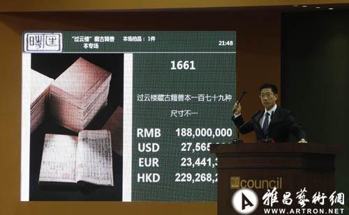 至于說(shuō)“過(guò)云樓藏書(shū)”是匡時(shí)2012年春拍最大的“賭注”,從匡時(shí)這兩日的拍賣(mài)結果來(lái)看是正確的,拍賣(mài)前,匡時(shí)方面公布2012年春拍的總成交會(huì )在十億元左右,但是僅僅是兩天的成交,戰績(jì)已經(jīng)有8.2億元了,其中過(guò)云樓藏書(shū)就貢獻率2.162億元。