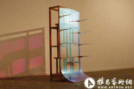 賈淳的作品以白色為基調,在藝術(shù)家眼里白色不單單是純潔、平靜、神圣的代表,更是無(wú)限顏色的依托、依靠,它反射著(zhù)自然界里的顏色,并吸收所有的顏色然后又釋放出來(lái)。另一方面,對于空間、建筑與材質(zhì)的結合,以及在材質(zhì)上的嘗試和創(chuàng )新是賈淳的游戲法則。不同的材料在兩種或幾種不同的語(yǔ)言軌道上混合,并分享著(zhù)相同的興趣,而從中所體現出來(lái)的質(zhì)感又是情感的再現。其中一件類(lèi)似家具的作品“Rayon”就是對家具這個(gè)構成語(yǔ)言的結合在藝術(shù)實(shí)踐上的對話(huà),帶有中國傳統風(fēng)格的書(shū)架與摩登的現代結構組合成看似有實(shí)用功能性的藝術(shù)作品,而熱塑性塑料板夾置于陳木與不銹鋼的零件中間,又間接表現了藝術(shù)家在兩種語(yǔ)境下的夾縫存生的境況。