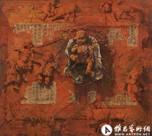“還有幾件作品就是我比較早期的那些,應該講是我比較年輕的時(shí)候,還處在“85運動(dòng)”時(shí)期狀態(tài)下面,對觀(guān)念藝術(shù)特別迷戀的那個(gè)時(shí)候的幾張靜物,比如說(shuō)《天惶惶地惶惶》,《對白》等作品,可以看出是在寫(xiě)實(shí)繪畫(huà)中盡量的把觀(guān)念的東西引入到里邊去的繪畫(huà)。這幾張畫(huà),是當時(shí)我畫(huà)得比較典型的幾張,其中有一張《天惶惶地惶惶》是沈桂林先生這一次從保利拍賣(mài)公司拍下來(lái)的,這張畫(huà)很早以前很便宜地賣(mài)出去了,賣(mài)給了一個(gè)臺灣人,那臺灣人又返回了中國,今年春拍沈桂林先生從保利拍回來(lái),花了300萬(wàn),這張作品是有故事的。的確觀(guān)念這個(gè)東西我是這樣認為,它有一種引導性,有效性,它具有一種運動(dòng)性和如何同國際鏈接的功能在里頭,他有這種大的概念在里頭,同時(shí)觀(guān)念藝術(shù)要把觀(guān)念引入到繪畫(huà)里邊,自然地引入到繪畫(huà)里邊去,成為你繪畫(huà)中一個(gè)重要的亮點(diǎn),必須發(fā)自于內心一種深刻的理解和一種感覺(jué)上的沖動(dòng),我是這樣認為,這種觀(guān)念的引入具有合理性,甚至還有共鳴的意義在里頭。這張繪畫(huà)叫《天惶惶地惶惶》,畫(huà)的是一張紅色的作品,上面有很多玩偶,當中有一個(gè)玩偶被禁錮,被鐵條禁錮在一個(gè)石膏做的襁褓里頭,是什么意義呢?我為什么要回憶呢?因為這個(gè)繪畫(huà)到現在快二十年了,那個(gè)時(shí)候我的女兒一天到晚生病,我是經(jīng)常半夜起來(lái)把她送到醫院去,因此我內心充滿(mǎn)著(zhù)一種糾結甚至恐怖,我只要聽(tīng)到我女兒咳嗽一下我就想完了,后面的事情就來(lái)了,只要她咳嗽一下,流點(diǎn)兒清鼻涕,馬上接著(zhù)就不可收拾,非要到醫院就吊一個(gè)禮拜針或者住院,最后才慢慢好起來(lái),因為我那一段時(shí)間內心是煎熬的,因此我把這種情感,這種煎熬和糾結,恐怖的心境,主要是用這個(gè)東西寄托,把它發(fā)泄出來(lái)、抒發(fā)出來(lái),我選擇這樣的題材!疤旎袒,地惶惶”是我們民間里的一個(gè)符咒,你們可能不知道,過(guò)去我們小時(shí)候在大街小巷墻頭上面,公共設施上面,電線(xiàn)桿上面經(jīng)?梢钥吹竭@種符咒,上面寫(xiě)的是什么?就是“天惶惶,地惶惶,我家有個(gè)夜哭郎,過(guò)路的君子念一遍,一覺(jué)睡到大天光”。它是這么一個(gè)符咒,什么意思呢?天惶惶地惶惶這是一個(gè)說(shuō)法,就像念咒語(yǔ)一樣的,我家有個(gè)夜哭郎,孩子病了,在家里通宵達旦哭,怎么辦?靠所有的人幫我把這個(gè)病給驅逐出去,于是我貼了符咒,過(guò)路的君子看到這個(gè)要念一遍,小孩病就好了,就一覺(jué)睡到大天光,是這么一個(gè)意思。于是你可以看到我的畫(huà)面上小孩禁錮,紅色的,首先你不看它什么意思,從畫(huà)面反映出來(lái)的感覺(jué),這種畫(huà)是不安的。害怕、不安、上邊有一些紙的殘片,殘片是什么呢?你可以看到雍正時(shí)候的中藥方子,藥同這些墜落的孩子、嬰兒、玩偶放在一起,產(chǎn)生不安的情緒,一眼可以識別出來(lái)這是一種對病態(tài)的恐怖,我起的名字叫《天惶惶地惶惶》。這張畫(huà)是有故事的,故事就是來(lái)自于這個(gè),因此畫(huà)了這張畫(huà),我很喜歡這張畫(huà),我覺(jué)得這張畫(huà)保佑著(zhù)我的女兒,我女兒長(cháng)大了,病好了,現在一個(gè)亭亭玉立的女孩,身體很健康。這張畫(huà)現在又回到我的朋友這里我很高興,于是拿到這里作為主要作品進(jìn)行展示!