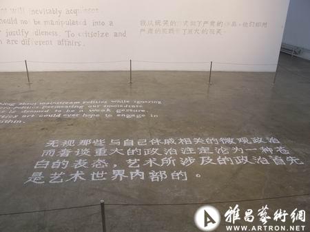 蘇上舟的作品以圓的外形和絢爛的蝴蝶翅膀象征了一個(gè)豐盛而虛妄的消費社會(huì ),這是多麼典型的一個(gè)放大的萬(wàn)花筒景象,那些絢爛而轉瞬即逝的浮華和美麗以死后的蝴蝶作為回憶及悼念的符號,作為對生活、生命本身的崇拜和渴望恰恰反襯了物質(zhì)生產(chǎn)的虛妄和消費的神話(huà)效應。陳?ài)啃墼谡箟ι纤蹩痰奈淖炙坪跻徽Z(yǔ)雙關(guān)地隱射消費社會(huì )下經(jīng)濟生產(chǎn)的本質(zhì),一方面他在契刻的行為上預設生產(chǎn)的“勞動(dòng)力消耗”,另一方面他把掉下的墻灰重新在地板上拼在一起組成文字(這些文字在展覽途中將被漸漸模糊)正好象征著(zhù)物質(zhì)和意義的轉瞬即逝!