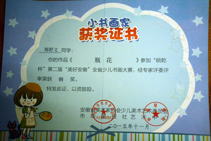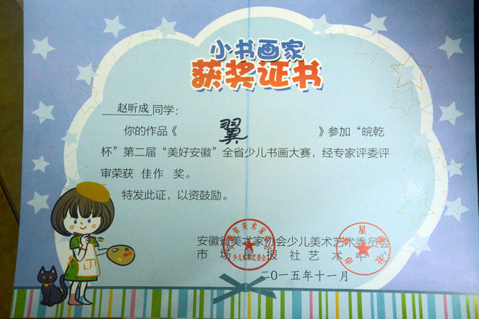 金秋送爽,我省市場(chǎng)星報與美協(xié)聯(lián)合舉辦“皖乾杯”第二屆“美好安徽”全省書(shū)畫(huà)大賽也落下了帷幕。經(jīng)過(guò)層層選拔后,我校有六名學(xué)員參加并在比賽中獲得了喜人的成績(jì)!我校有現合肥六中何雯琳同學(xué)獲得銀獎,現樂(lè )農小學(xué)奧林校區鄭舒文同學(xué)獲得銅獎,六安路小學(xué)的趙昕成、安三小的賈翊翔同學(xué)獲得佳作獎。為以上同學(xué)獲得的成績(jì)給予表彰獎勵!并希望在這次大賽中獲獎的同學(xué)要戒驕戒躁、再接再厲,力爭取得更大的成績(jì)!